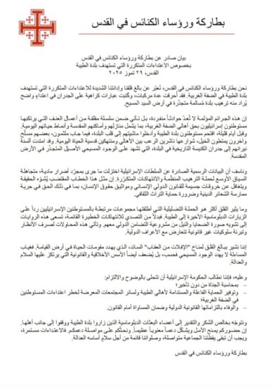 بيان صادر عن بطاركة ورؤساء الكنائس في القدس بخصوص الاعتداءات المتكررة التي تستهدف بلدة الطيبة